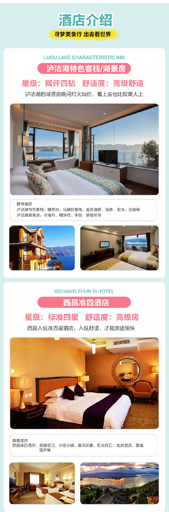 1.住宿:泸沽湖客栈2晚(标准间无空调) 西昌1晚标准(2人间),如出现单男单女,旅行社有权安排3人间或客人自行补单房差)。(泸沽湖属少数民族地区,条件有限.入住2-3人间,无空调以及一次性洗漱用品等;客栈多为太阳能或电热水器、热水供应有限,如当天日照充足便有热水供应但不稳定,如阴雨天或电压不稳定可能无热水供应,建议客人早点回酒店洗澡)